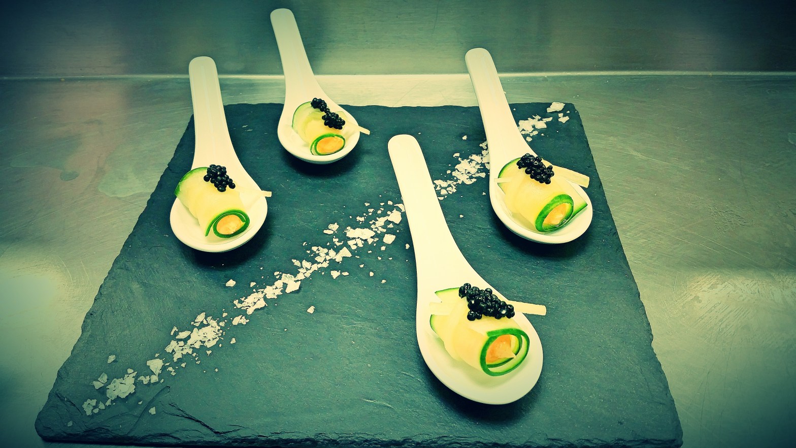 Cucumber roulade with smoked salmon-paprika mousse and caviar, London 2015